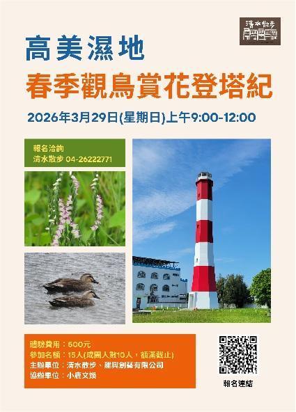 體驗內容:海堤水鳥觀察、與高美燈塔的紅白浪漫奇遇、蘭花科綬草見面會