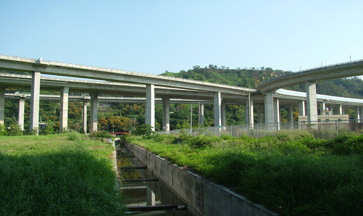 公園上方為台中港系統交流道,是國道三號、四號交會的地方,交流道在此架設數百株高聳的高架橋水泥柱,錯綜複雜的道路互相交織,有如雲霄飛車遊樂場現場,場景相當壯觀,搭配周邊的藍天綠地造就一個美麗的客庄水泥叢林公園。