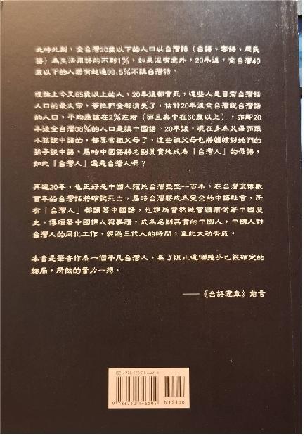 中語,屆時中國語將名副其實地成為「台灣人」的母語,如此「台灣人」還是台灣人嗎?